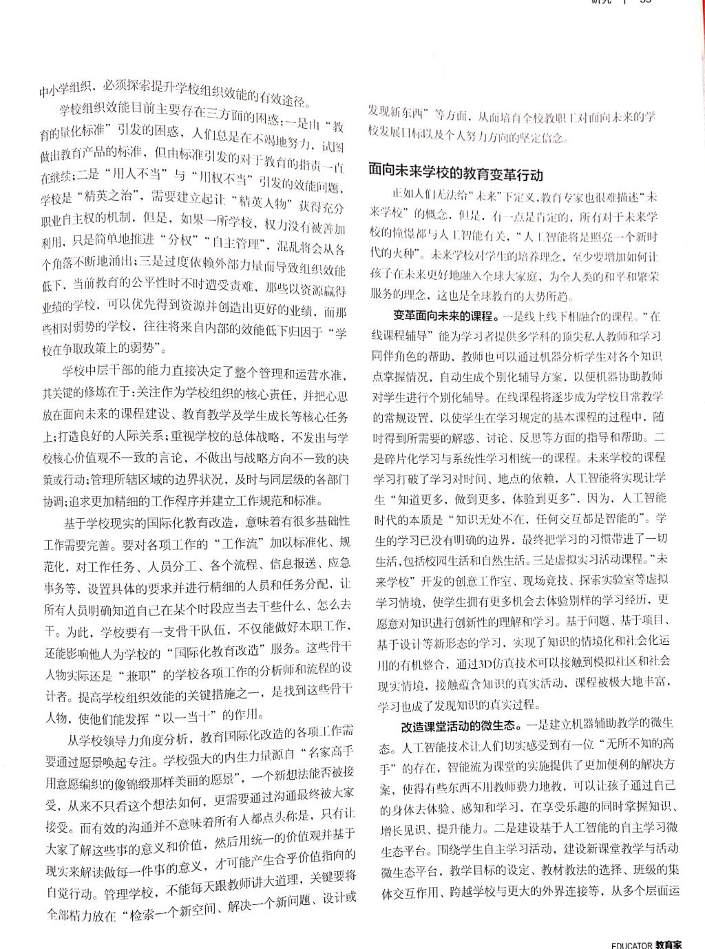 学校面向未来的国际化教育改造,需要进一步提升组织效能,提高学校领导力。学校教育存在诸多问题,常常与效能低下、领导力不足有关,要想创造一个有生机、有活力的中小学组织,必须探索提升学校组织效能的有效途径。