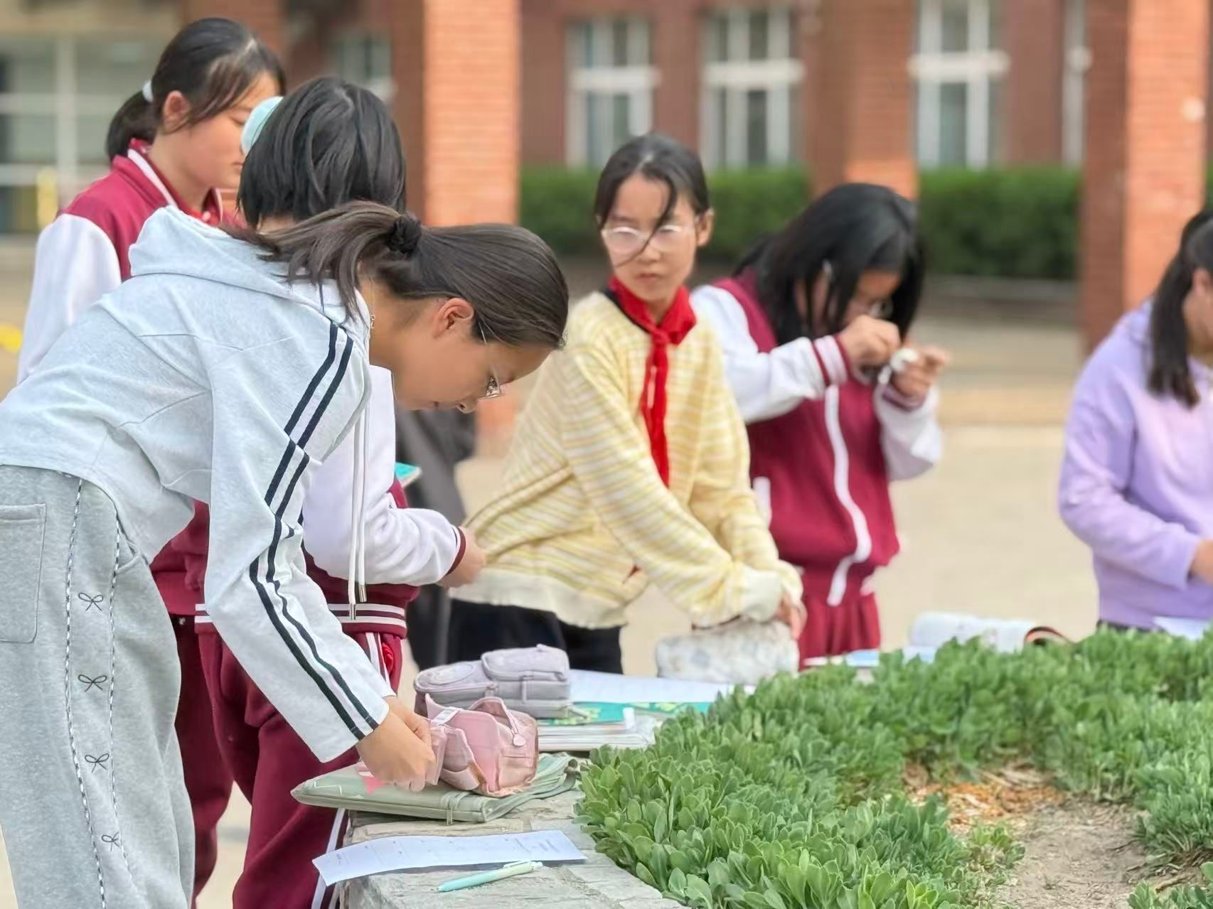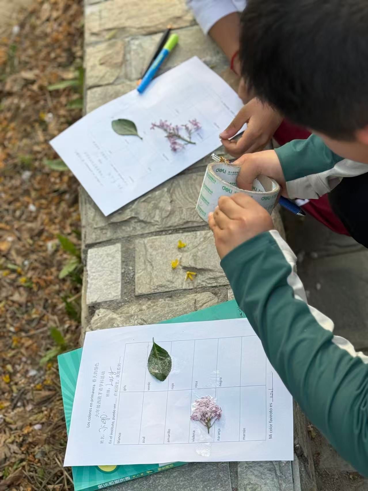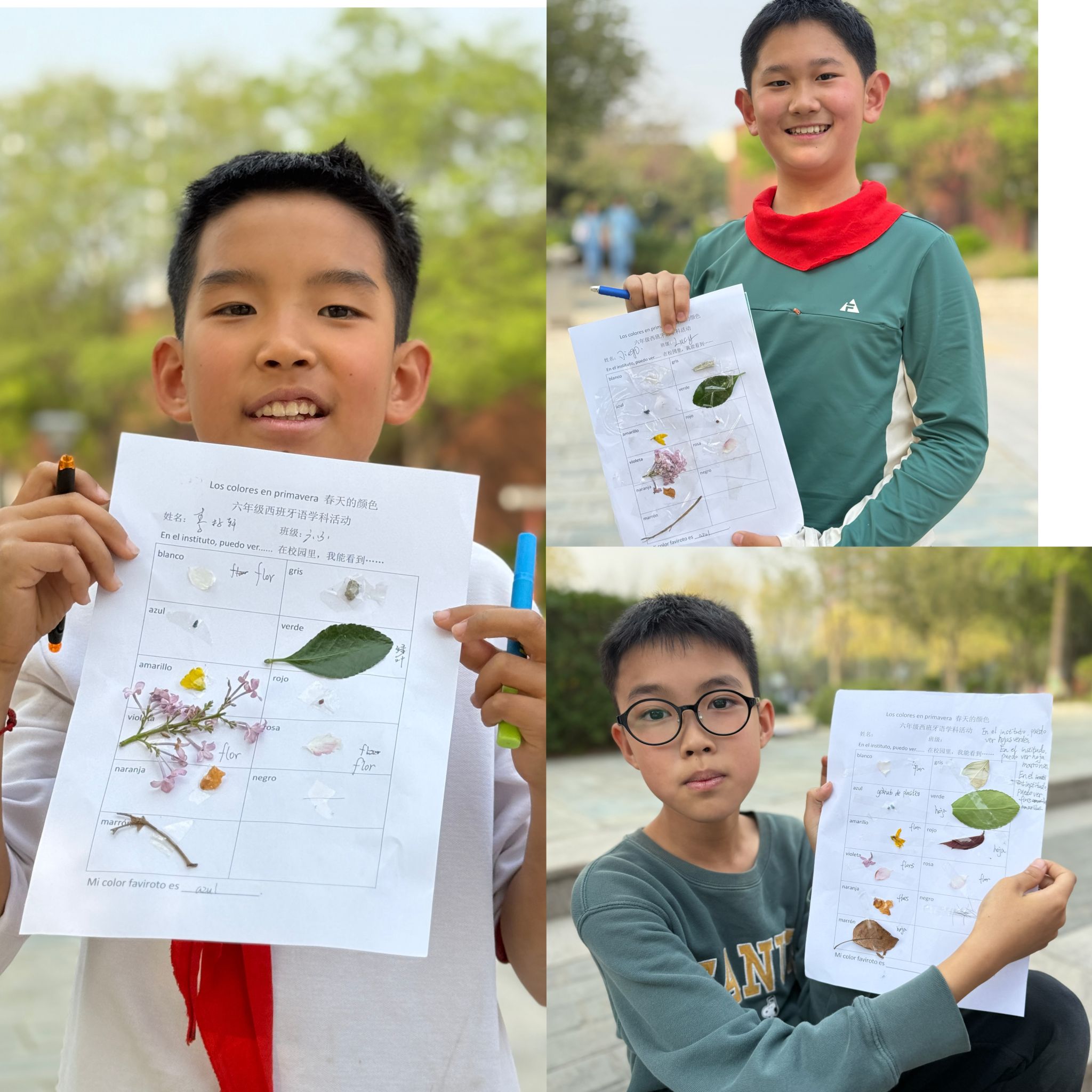 活动当天,阳光正好,微风不燥,孩子们手持任务单,化身“春日寻色小侦探”,穿梭在北外附校的校园角落。教学楼前的樱树缀满粉白花瓣,孩子们轻声念出西语“rosa”(粉色);草坪上的新叶舒展身姿,他们一笔一划记下“verde”(绿色);迎春花的金色花盏倾泻而下,“amarillo”(黄色)的发音伴着笑声随风飘散;澄澈的天空下,“azul”(蓝色)的拼写成为春日里最灵动的注脚。孩子们认真观察、积极记录,将校园里的每一抹春日色彩,都转化为西语学习的生动素材,让原本抽象的语言词汇变得可看、可触、可感,真正实现了“让学习在春天里落地生花”。