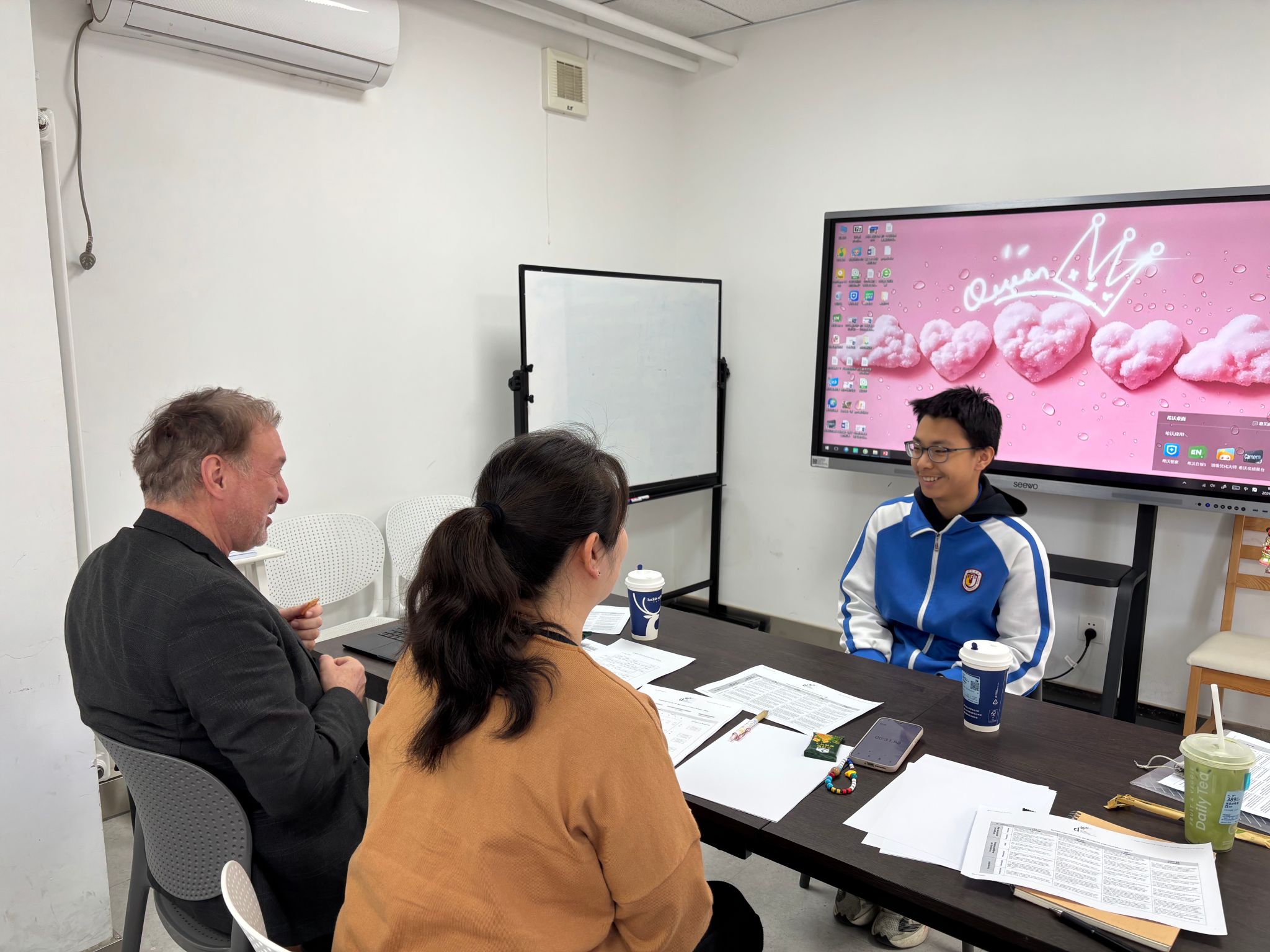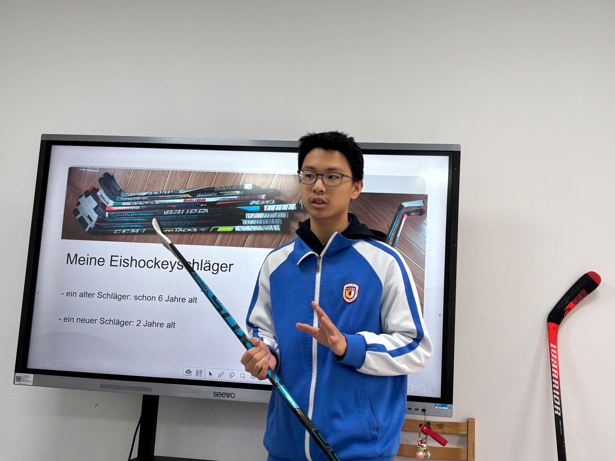 来自初三1+3班的李浩珵同学一马当先,以满分的优异成绩拔得头筹!考试中,他流利幽默地与德国考官围绕“冰球”主题展开了深度交流。他不仅现场展示了心爱的两只冰球杆,更生动讲解了冰球技巧。考官对中国少年的热爱与专业度赞不绝口,全场互动热烈,展现了北外附校学子开放、自信、灵动的国际风采。