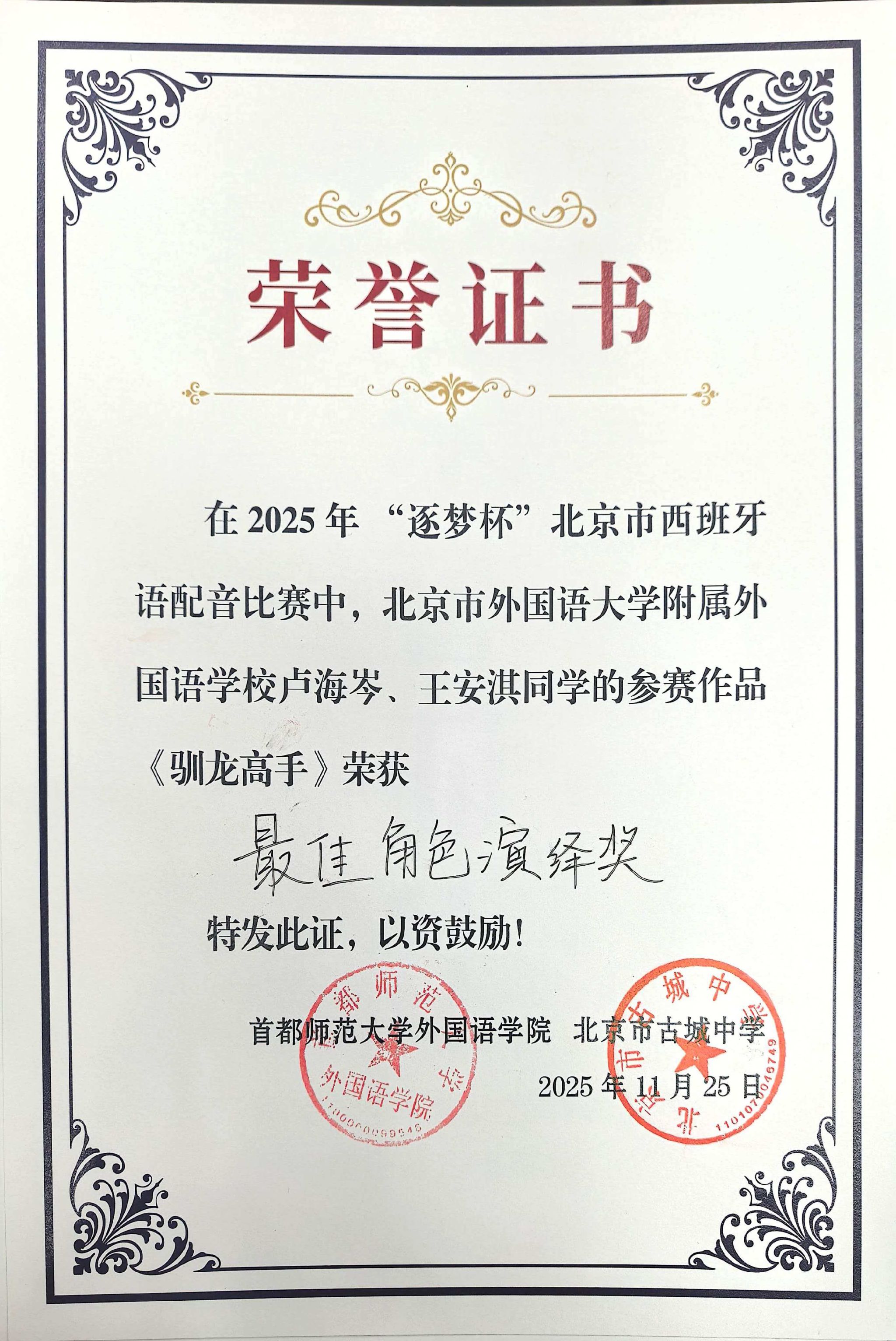 近日,2025年“逐梦杯”北京市西班牙语配音比赛圆满落幕。北外附校初一年级西班牙语学生卢海岑、高二年级西班牙语学生王安淇凭借出色的表现脱颖而出,斩获“最佳角色演绎奖”,充分展现了学校西语教学的扎实成果与学子的卓越风采。