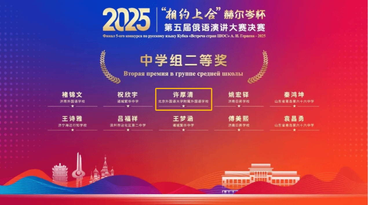 日前,2025“相约上合”第五届俄语演讲大赛圆满落下帷幕。北外附校俄语学子表现优异、再传捷报:高三(2)班郑祺滕、初二(11)班王知涵荣获全国一等奖,初二(11)班许厚清荣获全国二等奖。三位同学历经初赛、决赛两轮严格选拔,从全国98所中学的1323名中学组选手中脱颖而出最终在中学组仅设的5个全国一等奖席位中占据2席、10个全国二等奖席位中占据1席充分展现了北外附校俄语学科扎实的教学基础与学生良好的语言素养和综合能力。